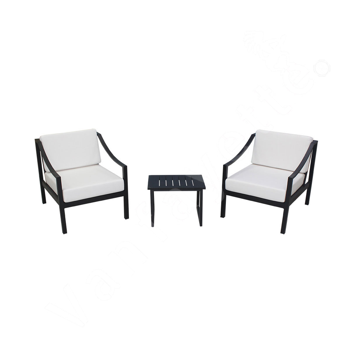 Built to last, the sofa features a powder-coated aluminum frame in a sleek matte black finish. Lightweight yet robust, this material is known for its rust-resistant properties and durability against the elements. Our furniture is designed to withstand all weather conditions, ensuring that your investment remains intact year after year. The standout feature of this set is the plush white cushions, filled with outdoor-grade foam that provides both comfort and aesthetic appeal.