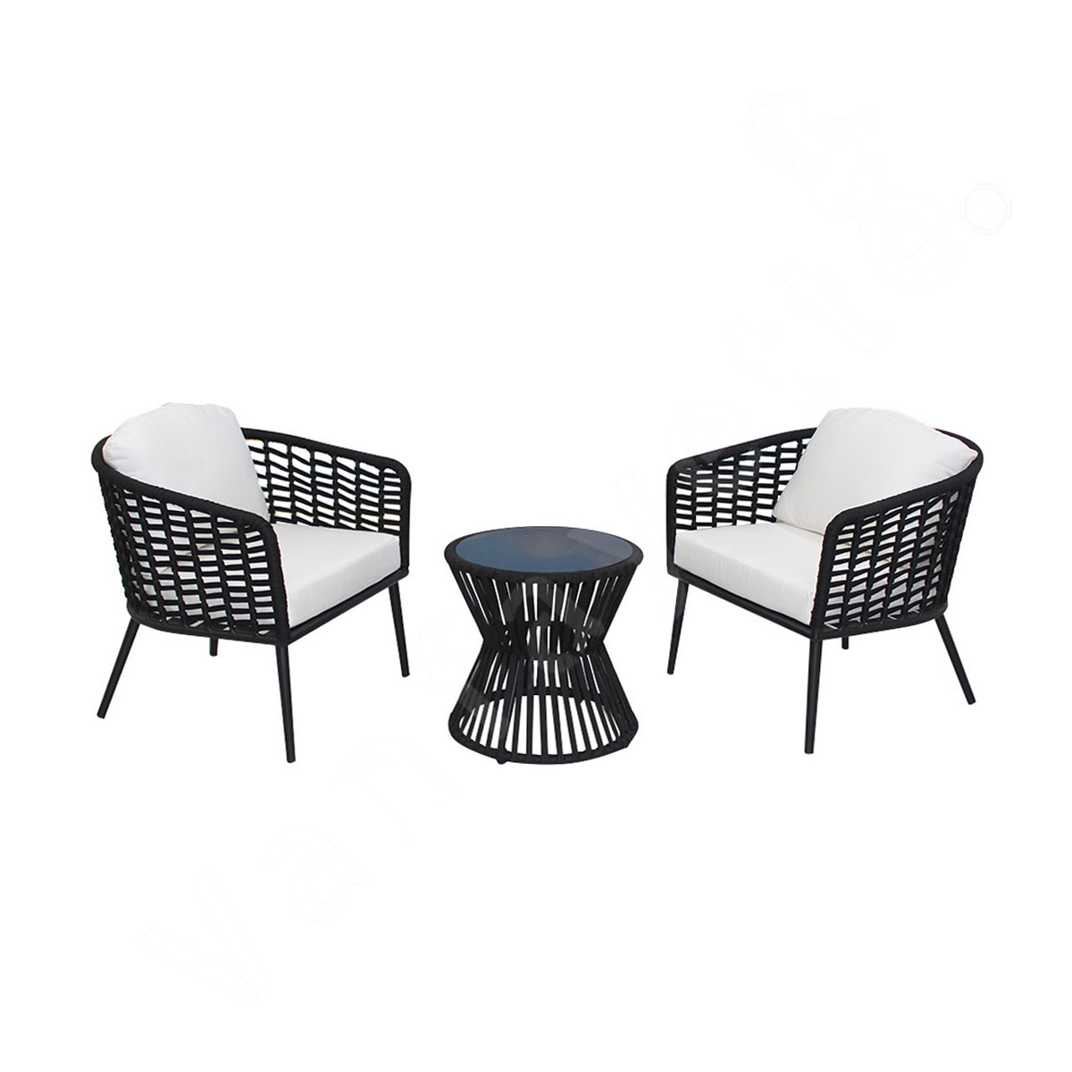 The foundation of our 2 Seater Balcony Sofa is its robust aluminum frame, finished in an elegant matte black. This sturdy structure is meticulously wrapped with weather-resistant rope, showcasing an intricate hand-weaving technique that elevates its visual appeal. The streamlined silhouette is beautifully complemented by plush white cushions, creating a harmonious contrast that fits seamlessly into diverse outdoor settings—whether you’re furnishing a sleek contemporary balcony, a stylish patio, or a charming garden nook.
