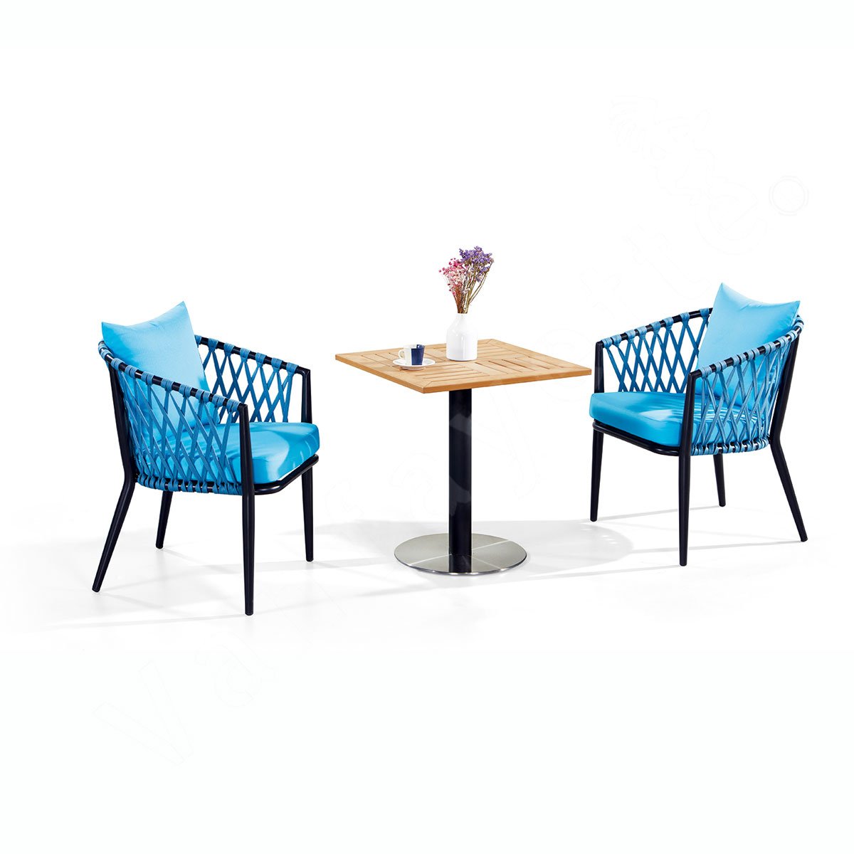 Each chair in this bistro set is crafted with a lightweight yet sturdy powder-coated aluminum frame, ensuring durability without compromising on comfort. Handwoven with outdoor-grade rope, the seating offers a contemporary texture that exudes casual elegance. The airy design not only invites relaxation but also complements the modern sensibilities of hospitality environments.