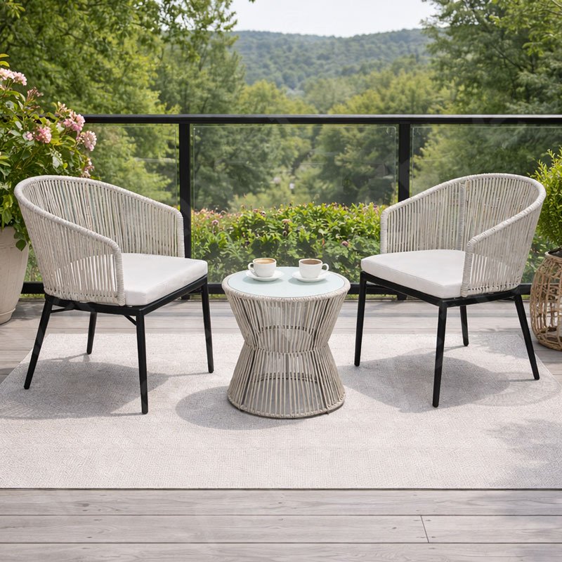 The plush grey cushions included with the set provide a sumptuous contrast to the starkness of the frame, blending comfort with a contemporary aesthetic. Its neutral color palette makes this garden furniture set a versatile addition that complements various outdoor environments, whether it’s a cozy corner on your balcony, a serene spot in your garden, or even a chic lounge area at a hotel. Perfectly sized for intimacy, this set is an invitation for morning coffees or evenings filled with engaging conversations.