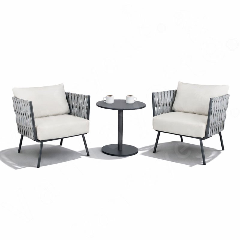 The 2 Seater Table And Chairs are crafted with robust aluminum frames finished in a deep charcoal grey, providing a stable and sturdy foundation that resists rust and wear. Each chair features handwoven high-performance outdoor rope in a matching grey tone, adding both texture and breathability to the design, while showcasing a remarkable touch of craftsmanship.