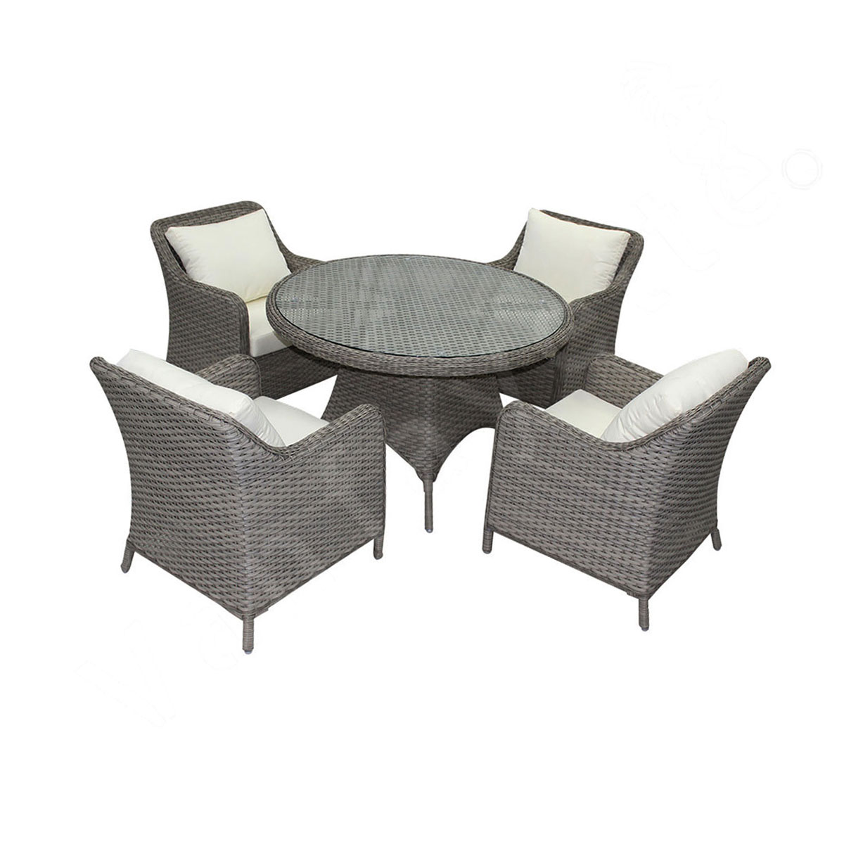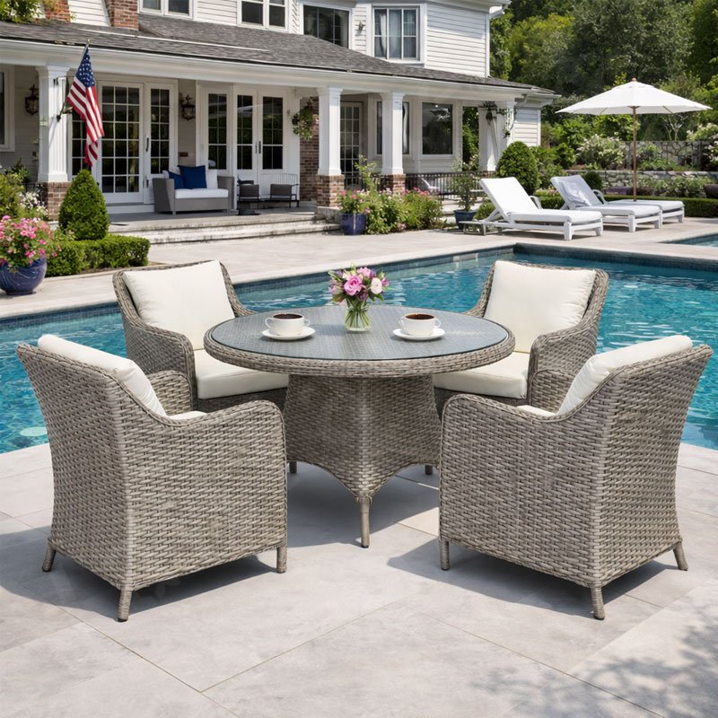 Transform your outdoor space into a stylish dining area with our 4 Chair Outdoor Table Set. This 4 Seater Round Garden Table and Chairs ensemble is the ideal choice for those looking to enhance their outdoor dining experiences, whether at home or in commercial settings. Featuring four elegantly designed armchairs and a classic round dining table, this set creates a warm and inviting environment that encourages relaxed conversations and enjoyable meals.