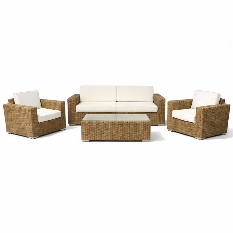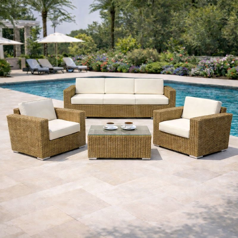 The design of our patio sofa set stands out with its elegant and grounded profile. With generous proportions and structured lines, it conveys a sense of calm, luxury, and lasting stability. Whether you wish to style it in a private garden, a hotel courtyard, or a beachside terrace, this set exudes understated class and contemporary outdoor appeal. The set consists of a spacious two-seater sofa, accompanied by two deep lounge chairs and a matching coffee table, providing ample space for four people to relax, socialize, or enjoy al fresco drinks and conversations. Each seating piece can be enhanced with weather-resistant cushions for added comfort, making it the perfect choice for outdoor gatherings.