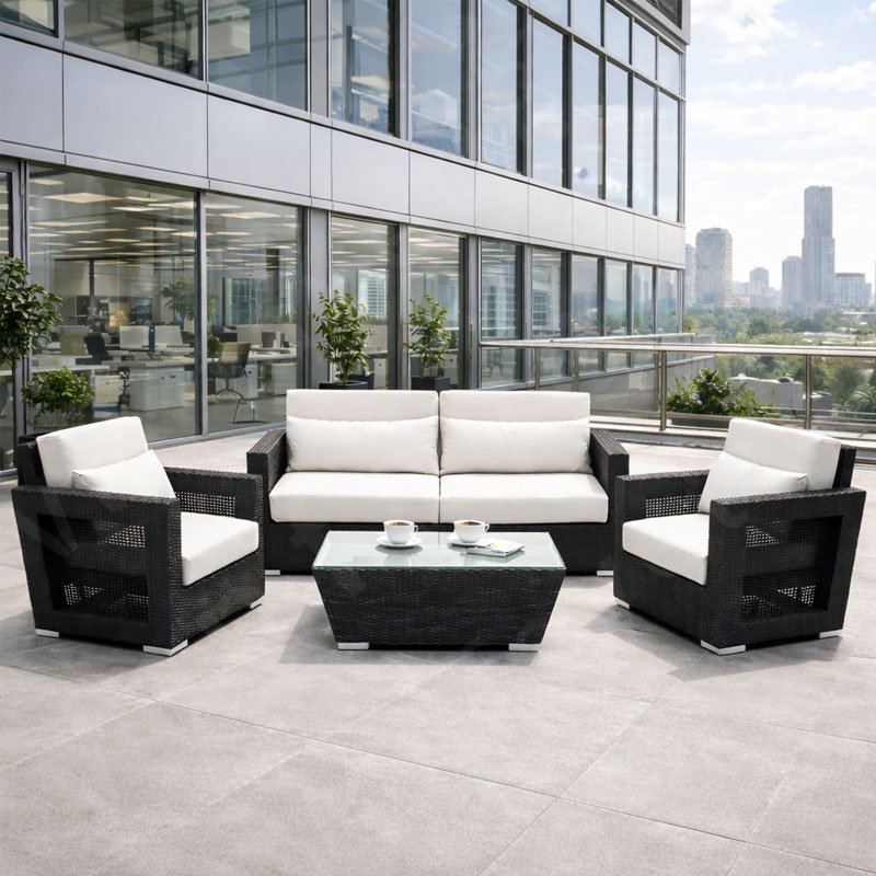 With its neutral-toned wicker finish and plush seat cushions, this outdoor sofa set creates a cozy yet elevated seating area. It includes a loveseat, two single chairs, and a matching coffee table—ideal for open-air gatherings, private lounges, or hospitality venues seeking an upscale yet approachable look. To ensure your investment lasts, we offer custom-fitted premium outdoor rain covers tailored to the exact dimensions of each furniture piece—providing long-term protection effortlessly. Designed for both style and practicality, this 4-seater set transforms any outdoor garden space into a sophisticated yet welcoming environment for rest, conversation, or coffee under the beautiful sky.
