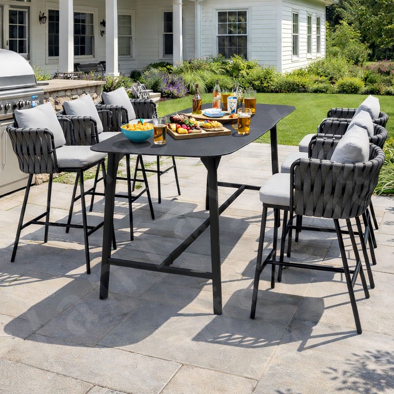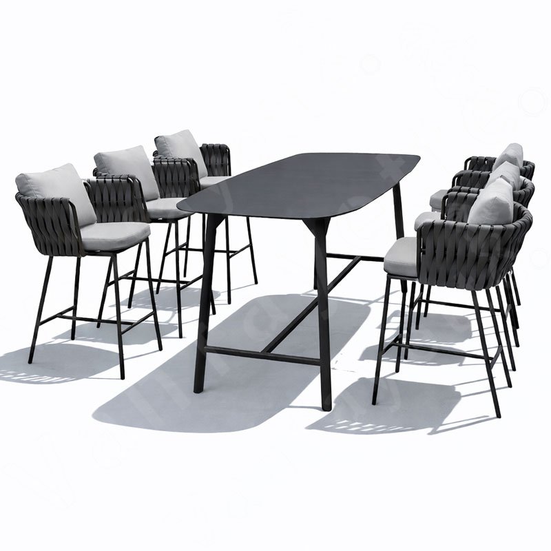 Built with a robust, powder-coated aluminum frame, this patio set promises longevity and weather resistance. Wrapped in specially designed outdoor rope, it provides a sleek, textured look while defending against the elements. Whether rain or shine, this set maintains its aesthetic appeal, making it an excellent addition to outdoor bars, boutique restaurants, hotel terraces, or your own sophisticated backyard.