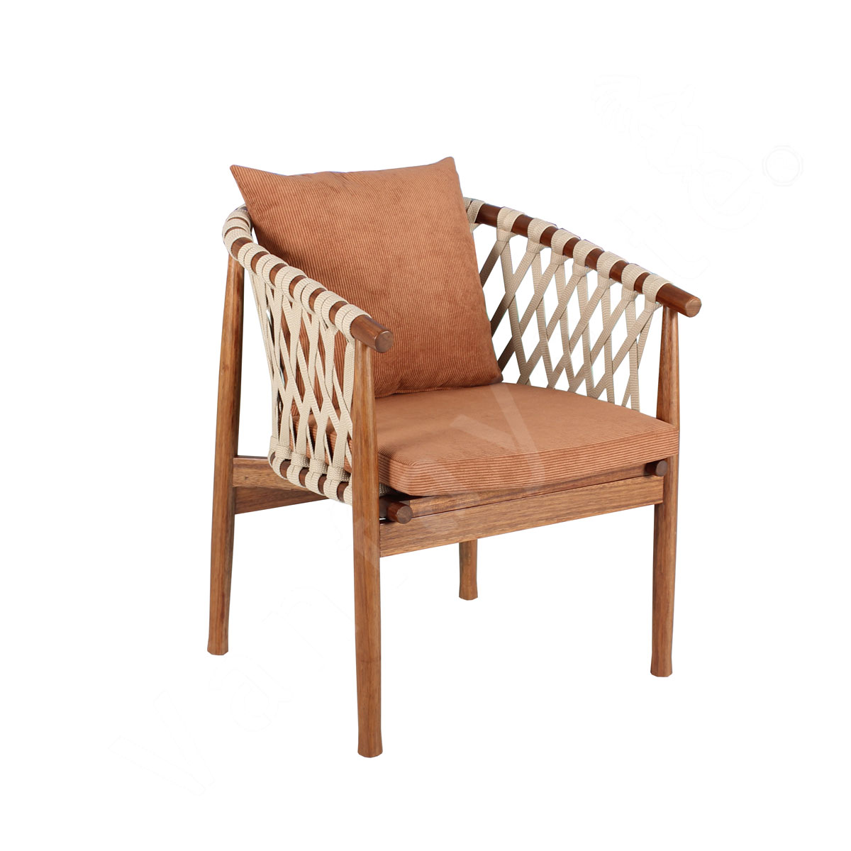 Each chair in the set is thoughtfully designed with a sturdy teak wood frame and an intricately hand-woven rope backrest, ensuring supportive seating and breathable comfort for your guests. The weather-resistant rope is UV-protected, making it specifically suitable for outdoor situations, while the elegant teak adds a timeless, natural touch that beautifully weathers over time.