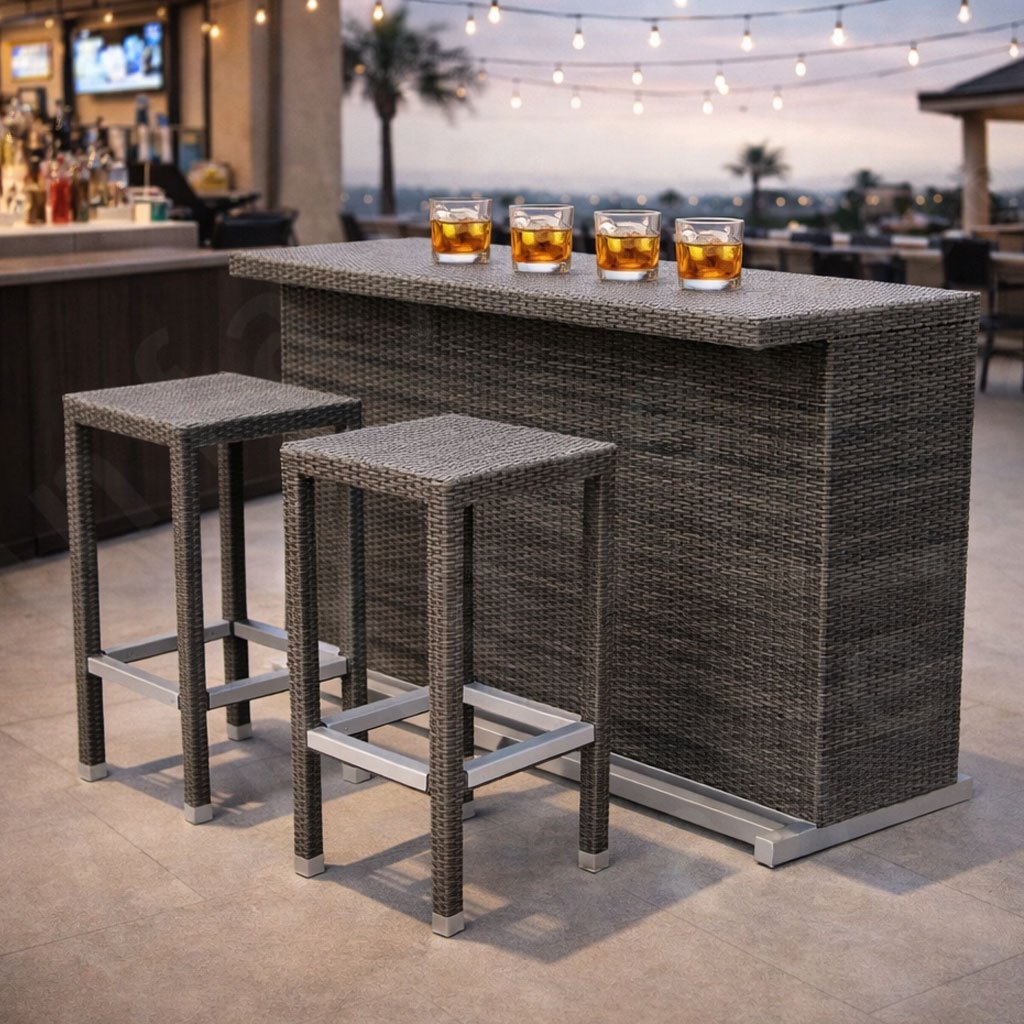 Transform your outdoor space into an entertaining paradise with our Bar And Stools For Garden set. This bar height outdoor table and stools set offers an exquisite blend of elegance and practicality, perfect for hosting friends and family. Crafted with a durable powder-coated aluminum frame and hand-woven PE rattan, this set ensures both aesthetic appeal and resilience in any weather condition. Ideal for both residential and commercial settings, it seamlessly fits in at rooftop bars, garden lounges, beachside cafés, or even private patios.