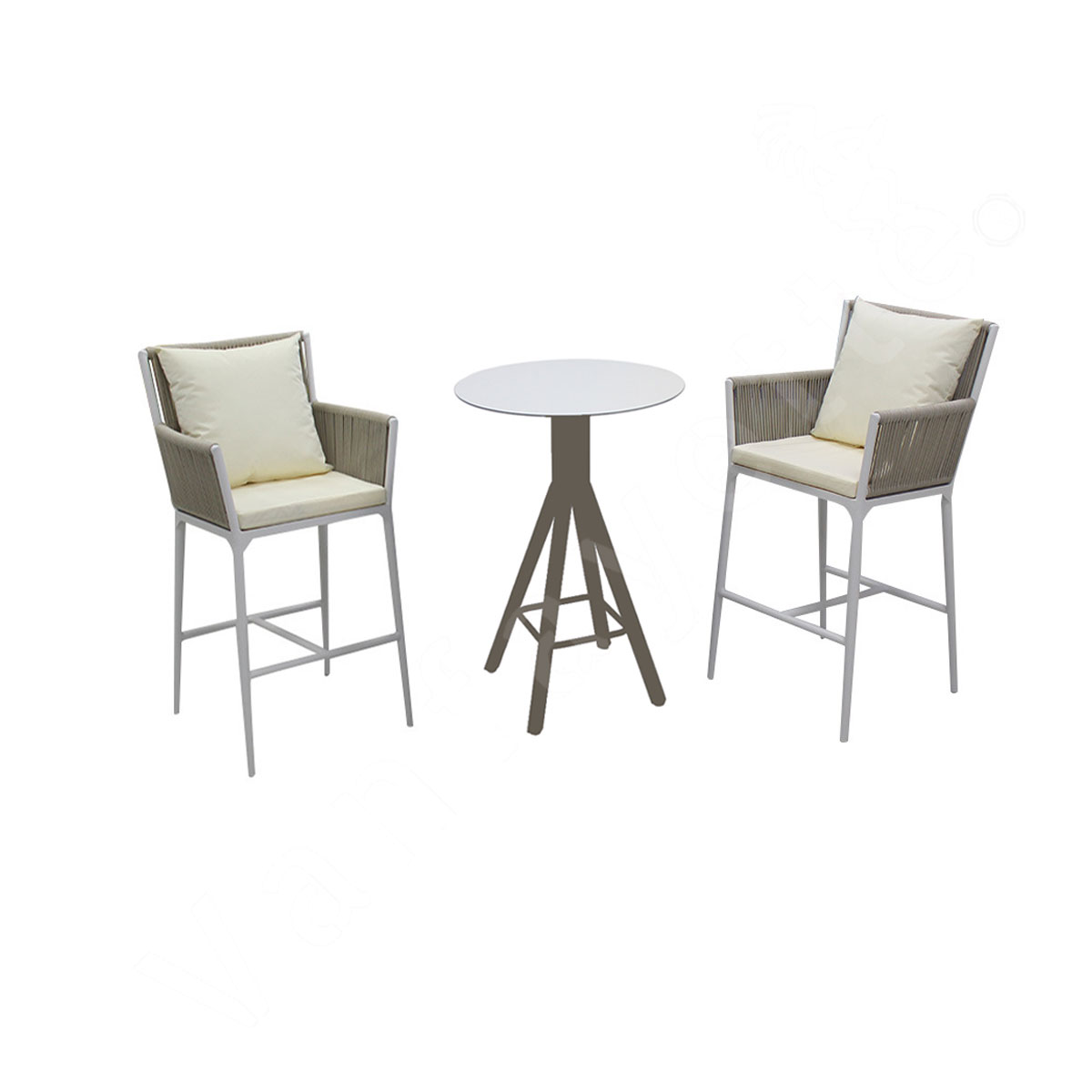 The centerpiece of this set is the sleek, powder-coated white aluminum frame, which not only adds a chic, contemporary look but also ensures lasting durability as it resists rust and weather elements. The unique handwoven deep grey outdoor rope on the seats and backrests brings texture and ergonomic comfort to your lounging experience, creating a subtle yet sophisticated contrast against the white frame. This refined balance makes it the perfect addition to balcony corners, rooftop settings, and trendy cafés alike.