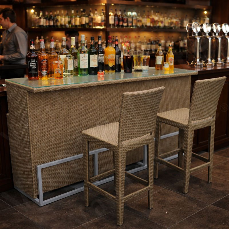 One of the standout features of our Bar Height Outdoor Dining Set is the multi-functional bar table, which comes equipped with a built-in storage compartment. This thoughtful design allows you to keep drinkware, service items, and personal belongings close at hand while keeping them neatly out of sight. This practicality makes the set particularly suitable for commercial use in locations such as rooftop bars, seaside cafés, resort patios, and poolside lounges.