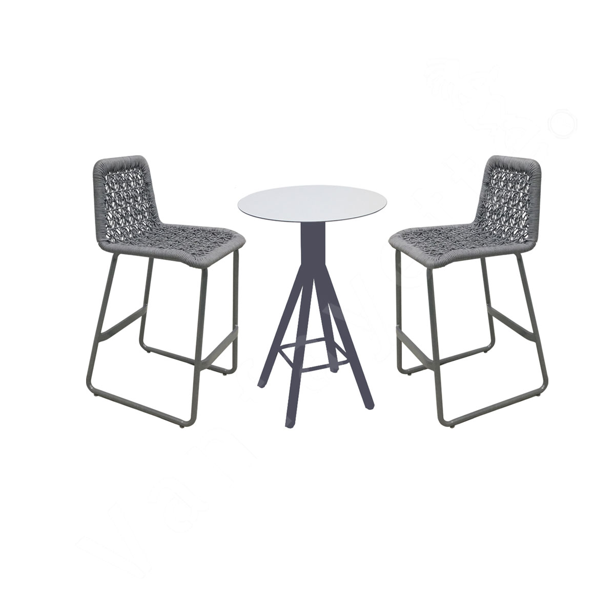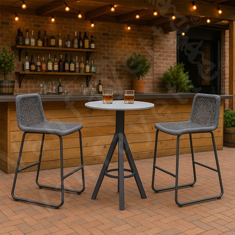 Introducing the perfect blend of style and functionality with our Bar Height Outdoor Table and 2 Chairs set. Designed to enhance both residential and commercial spaces, this outdoor seating solution is ideal for those looking to create a chic dining area, whether on a patio, balcony, or at a café. The set is crafted with a deep grey, powder-coated aluminum frame that ensures durability while offering a modern aesthetic.