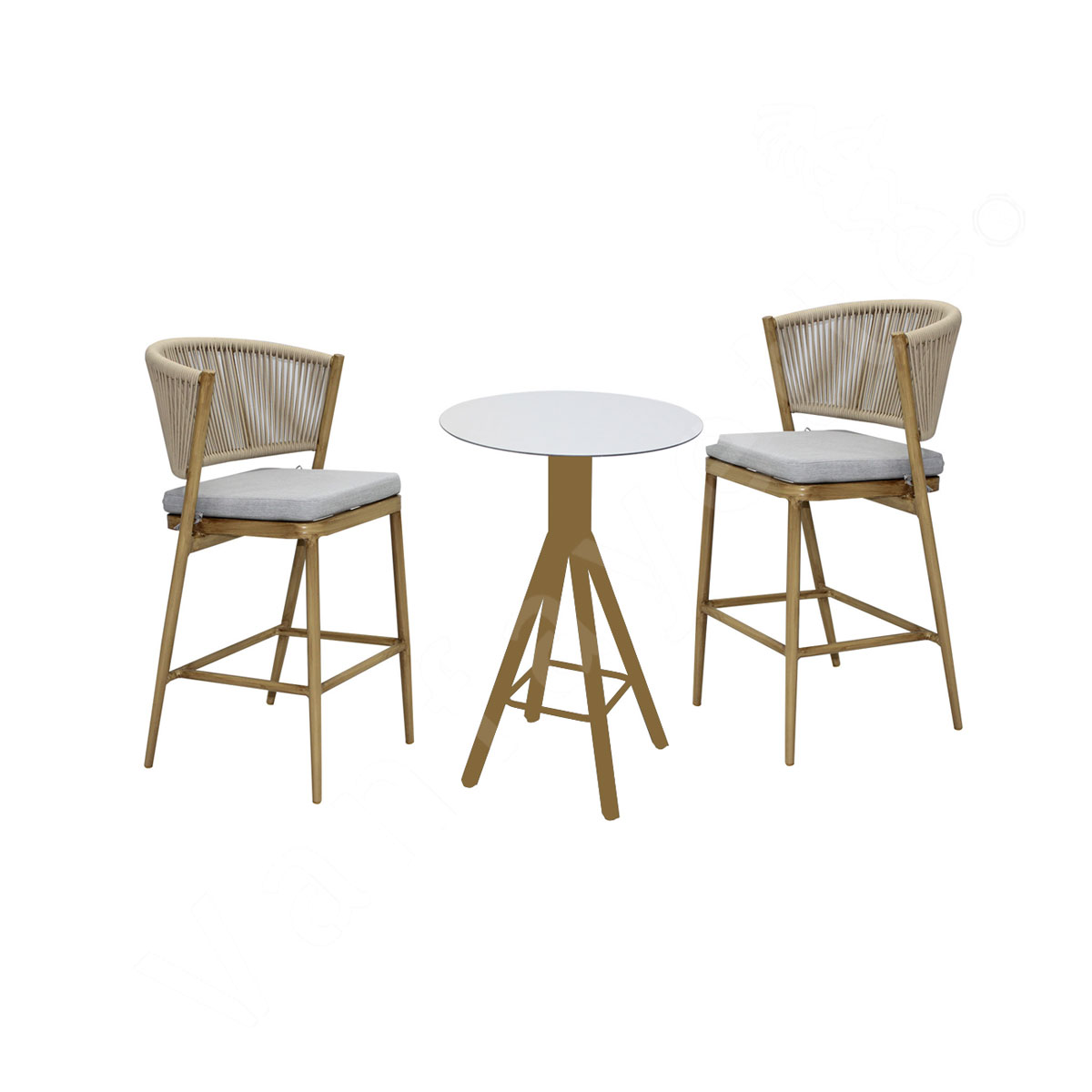 Elevate your outdoor gatherings with our contemporary Bar Height Outdoor Table and Chairs 3 Piece set. Crafted meticulously for both residential and commercial outdoor areas, this stylish ensemble delivers both comfort and sophistication. The muted khaki aluminum frame, coupled with soft grey rope weaving, creates a calming atmosphere that seamlessly integrates into any outdoor space.