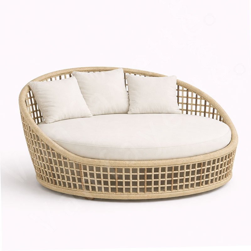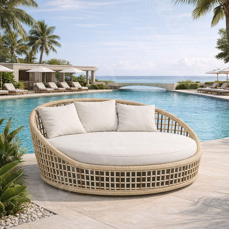 Featuring a circular form, this daybed provides ample lounging space, comfortably accommodating two to three individuals. It’s great for sunbathing, reading, or simply engaging in relaxed conversation, making it a versatile addition to any outdoor setting. The breathable rope weaving ensures ergonomic support while enabling natural ventilation, ideal for warmer climates. Its understated elegance contributes to a soothing ambiance without overwhelming the surrounding environment.
