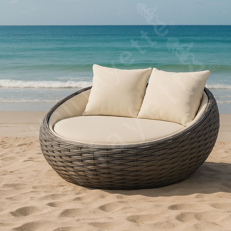 What sets The Circle Daybed apart is its PU leather–wrapped inner surface, offering a visual and tactile luxury rarely seen in outdoor daybeds. This refined finish enhances its high-end appearance, making it a perfect addition to five-star resort pool areas, beachfront decks, private villa terraces, or stylish homestays. The exterior combines textured wicker for understated charm, while the interior boasts smooth PU leather for an unparalleled luxe feel, creating a striking yet subtle contrast.