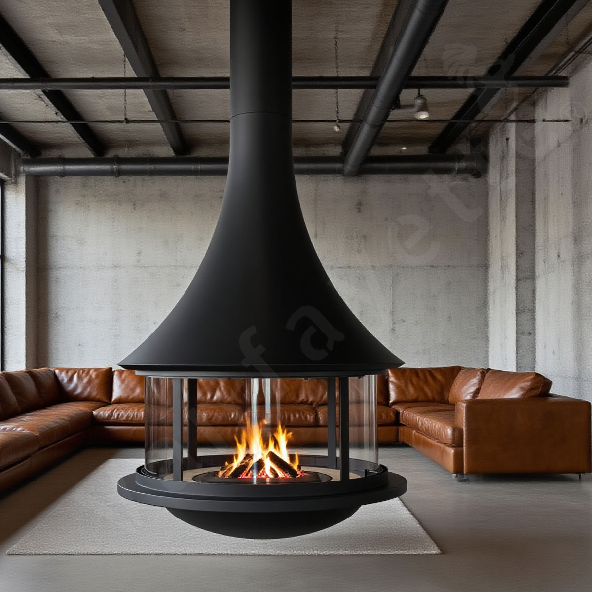 Ideal for living rooms, loft apartments, chalets, or boutique hotel lounges, the circular wood burning stove enhances the ambiance with its cylindrical glass chamber, delivering an immersive fire experience. Its hanging design makes it more than just an appliance — it becomes a centerpiece of modern interiors where comfort, style, and functionality converge.
