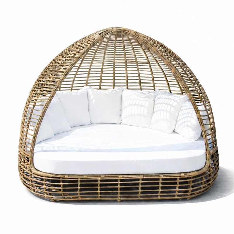 Its generous round shape encourages relaxed lounging for two or more, becoming the perfect spot for sunny afternoons or starry nights. The overhead canopy adds much-needed protection from direct sunlight, offering guests a comfortable escape from the heat. This high-end Outdoor Round Day Bed is styled with thick, inviting white cushions that contrast beautifully with the natural or espresso-toned rattan, enhancing the overall sense of refinement.