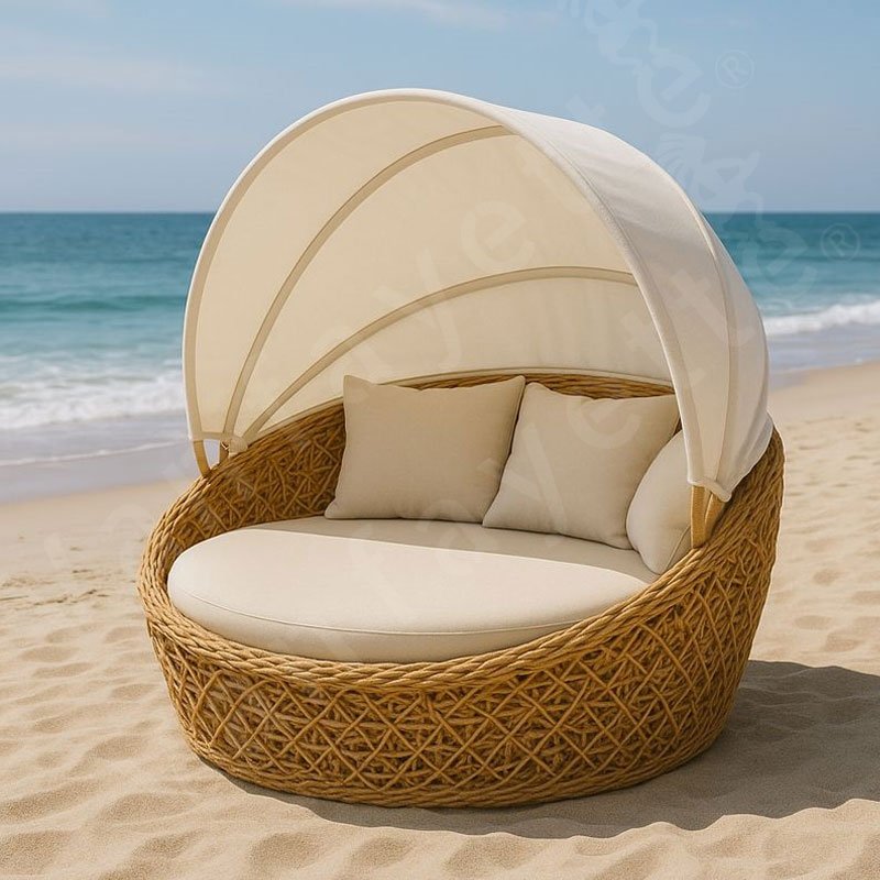 The Garden Day Bed With Canopy is your ultimate luxury outdoor daybed, blending artistic craftsmanship with refined comfort. Designed to transform outdoor spaces into serene retreats, this stunning piece features a powder-coated aluminum frame wrapped meticulously in high-quality outdoor PE wicker. Its signature bird-nest weaving creates a sculptural cocoon-like appearance that offers a sense of privacy and warmth while exuding an inviting resort atmosphere.
