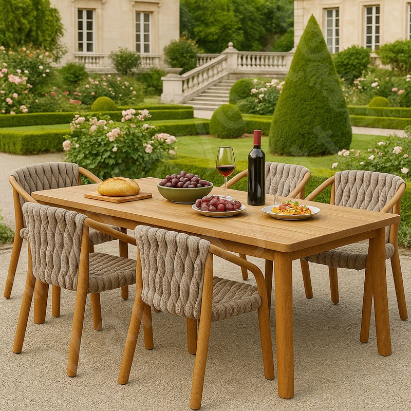 Each chair in this stunning set features a solid teak wood frame, celebrated for its inherent strength, remarkable durability, and beautifully rich natural grain. The teak frame provides exceptional stability and naturally resists moisture, sunlight, and changing climates, ensuring longevity and making it an ideal choice for long-term outdoor use. Complementing the robust teak is expertly handwoven outdoor-grade rope. This harmonious blend of teak and rope achieves a uniquely refined visual identity, merging organic warmth with contemporary texture.