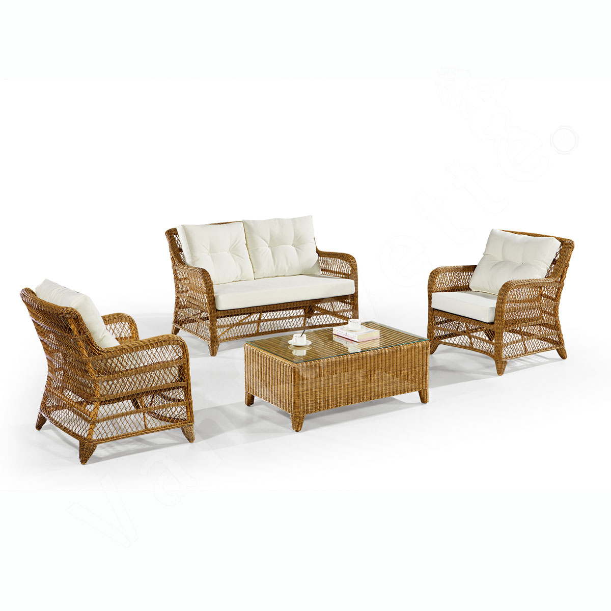The highlight of this stunning outdoor furniture set lies in its innovative open-weave technique. This design not only creates a sense of visual lightness but also promotes excellent air circulation. Coupled with thick white seat cushions, the set enhances the cooling effect, providing a bright and breezy summer feel in your outdoor area. With its 4-piece layout, which includes a spacious loveseat, two single armchairs, and a matching coffee table, this set comfortably seats four adults, making it perfect for casual gatherings or lively garden parties.