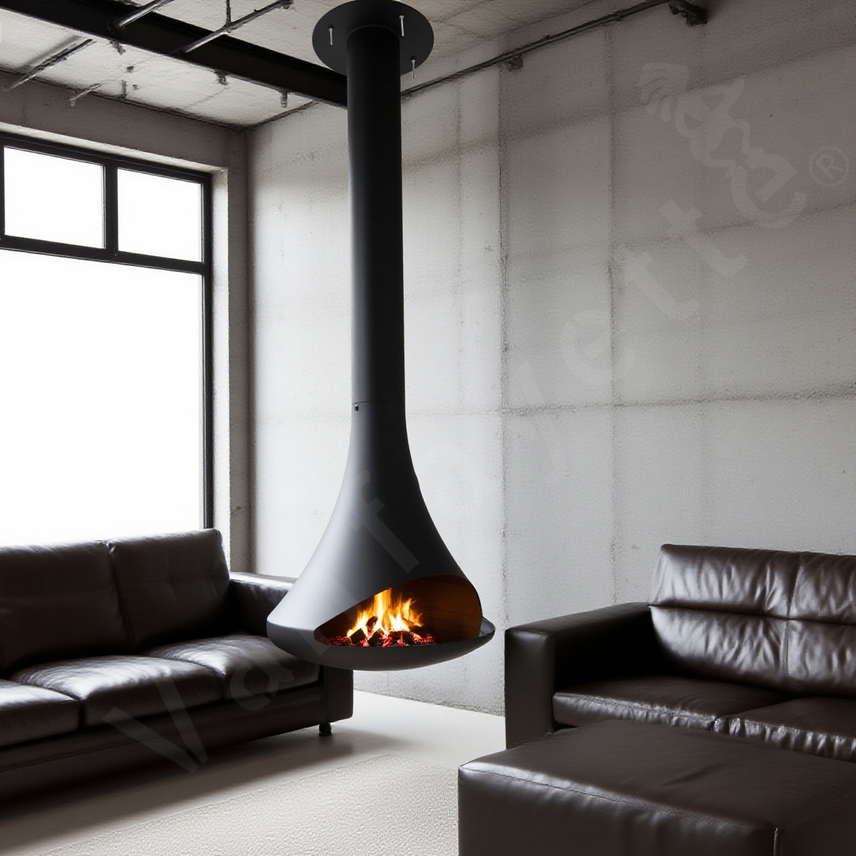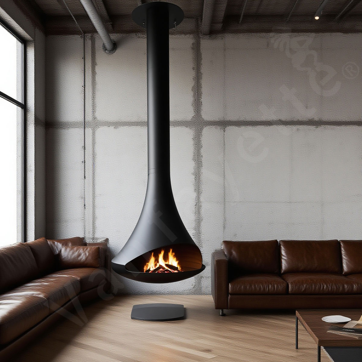 The indoor hanging fireplace and wood burning fireplace features a breathtaking trumpet silhouette, instantly elevating the style of any interior. Acting as more than just a heat source, this suspended fireplace is a dramatic centerpiece that blends functionality with sculptural elegance. Its distinctive design allows the fire to be viewed from a wide, open front, creating a mesmerizing ambiance while efficiently distributing warmth across the entire room. Perfect for both contemporary and rustic interiors, this fireplace offers homeowners a unique opportunity to transform their spaces into cozy, stylish retreats.