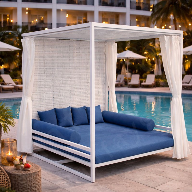 Ideal for spa decks, poolside terraces, or garden retreats, it blends modern outdoor design with resort-style comfort. To ensure your investment remains pristine, we offer custom-fit rain covers tailored to the size and shape of this daybed. Each cover is professionally crafted to protect against UV rays, rain, and dust—extending the life and beauty of your outdoor space. Whether you’re furnishing a tranquil hideaway or a vibrant hospitality venue, this beautiful daybed with curtains brings elegance, privacy, and all-day comfort to any setting.