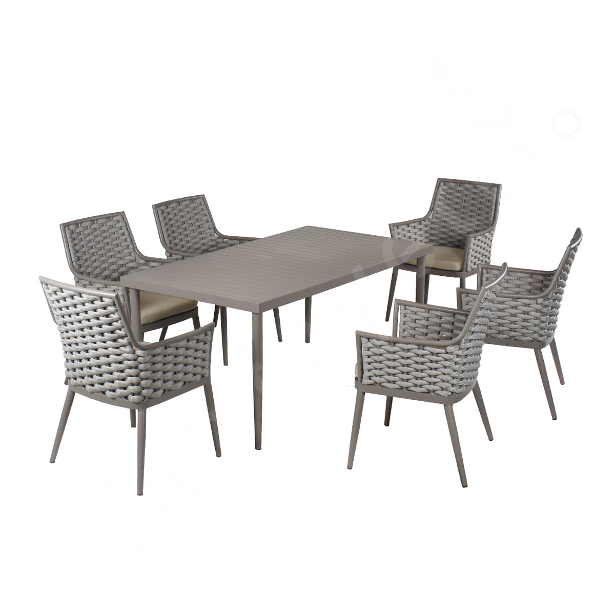 Enhance your outdoor space with our contemporary 6 Seater Garden Table And Chairs, a stylish Outdoor Rope Dining Set that perfectly combines elegance, comfort, and durability. Designed specifically for commercial outdoor spaces, this dining set features a lightweight yet robust aluminum frame, ensuring stability and ease of movement. Paired with expertly hand-woven rope crafted for outdoor use, it presents a sophisticated aesthetic that complements modern architecture.